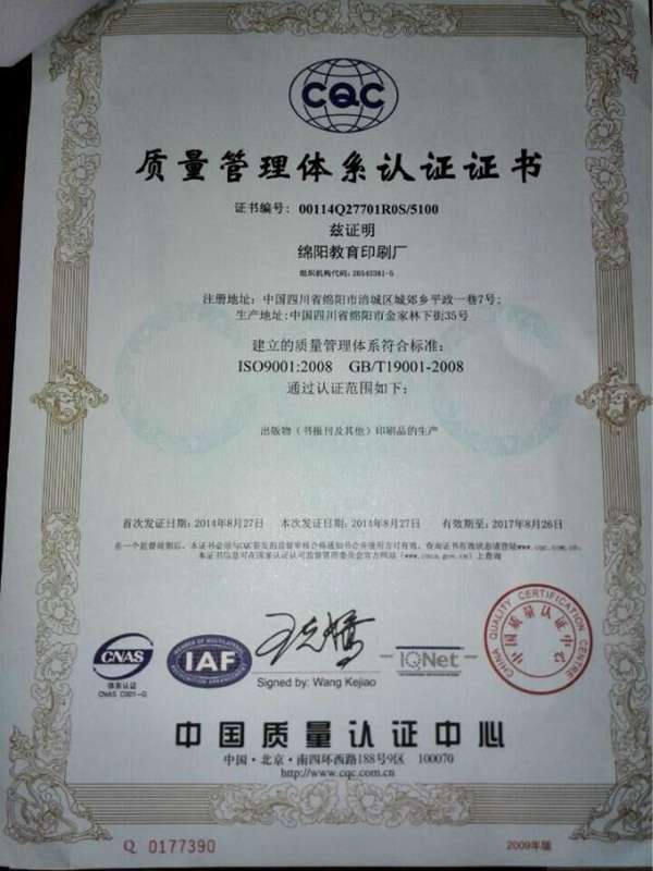印刷质量管理体系认证证书